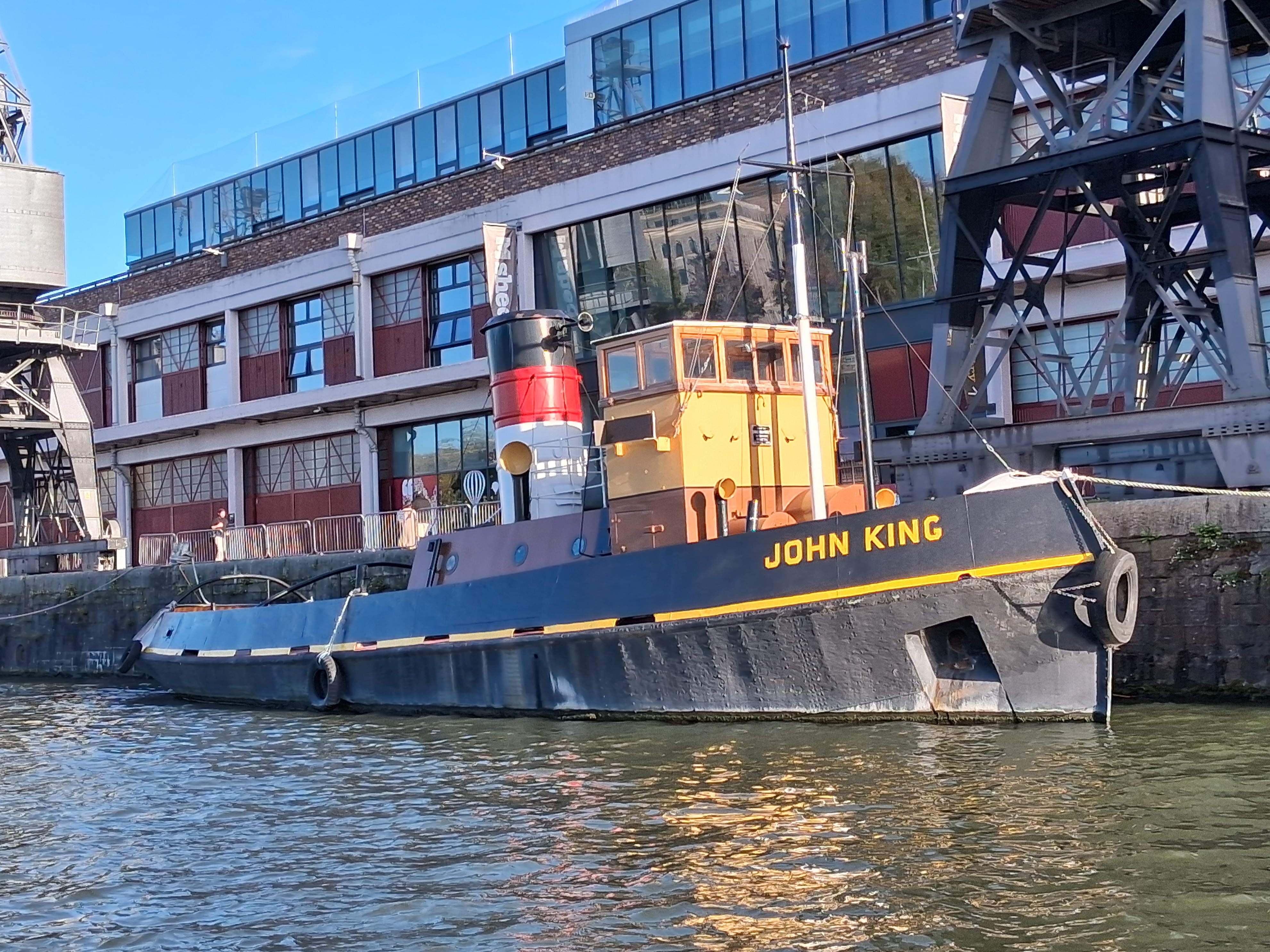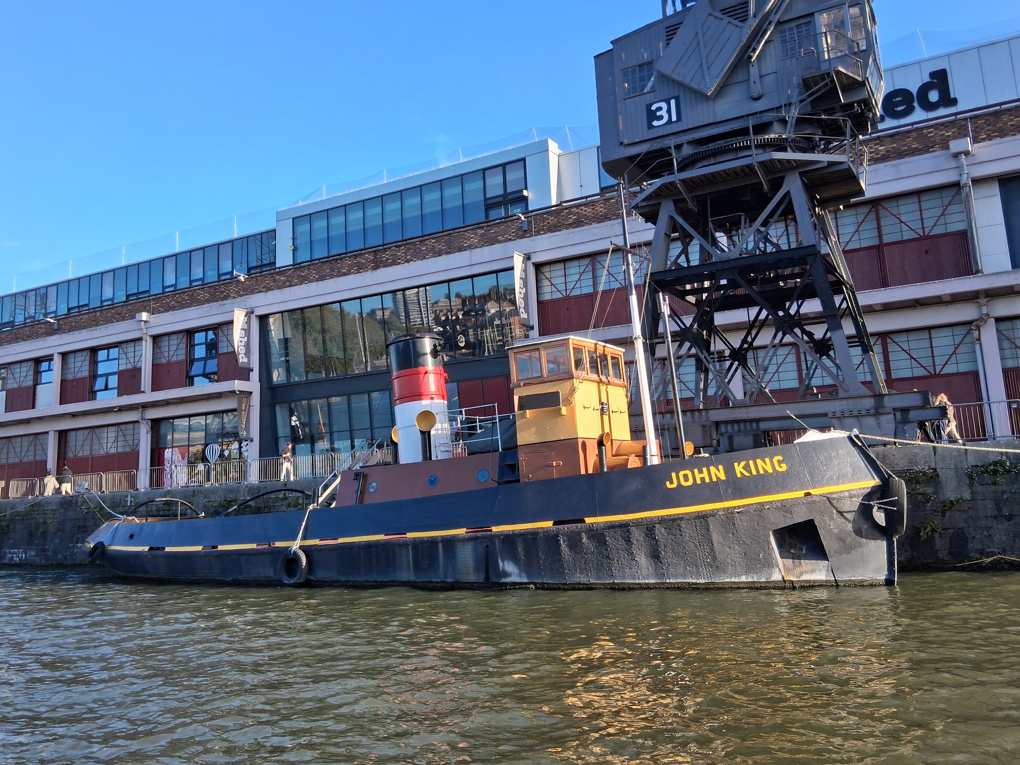 JOHN KING is a steel hulled tug built in 1935 by Charles Hill & Sons Ltd. of Bristol for Kings Tugs Ltd. on the lines of a steam tug. She was used for ship towage on the River Avon and in Bristol Docks until 1970. During the Blitz of 1940, she was employed for seventeen days fighting fires at the Pembroke Dock oil installations and, on her way back to Bristol, was attacked by a German aircraft. Her last job, on 6 July 1970, was to manoeuvre the ss GREAT BRITAIN into the Great Western Dock.